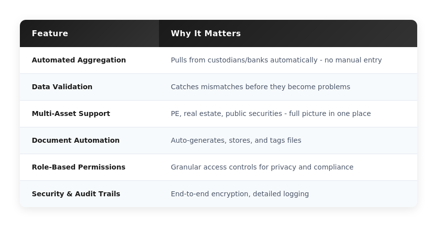- Role-based dashboards ensure each stakeholder sees only what they need—principals, investment teams, accountants, and advisors work from the same truth